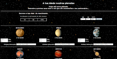 Um site mostra como saber saber a idade, caso você morasse em outro planeta. Para isso, basta inserir sua data de nascimento e o site mostrará qual seria a sua idade em outros planetas do sistema solar, conforme screen abaixo: