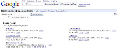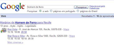 Está procurando por um bom filme, mas ainda não sabe quais as sessões disponíveis? Que tal procurar no Google? Basta fazer uma busca pelo nome do filme, em seguida colocar a cidade desejada e bingo! O Google te dá todas as seções disponíveis para aquela cidade. Veja o exemplo: